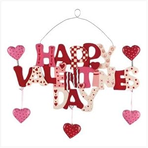 Wild and wacky sign displays your playfully romantic heart! Cartoon letters and dancing hearts spell out a charming Valentine's Day wish to one and all. Metal wire for hanging. MDF wood and metal. Measures: 13 1/4" x 1/2" x 9 3/4" high; hanging 12 1/2" high.
