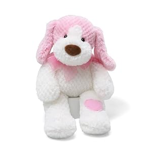 Gund's pink and white dog with a pink ribbon around its neck and a pink embroidered